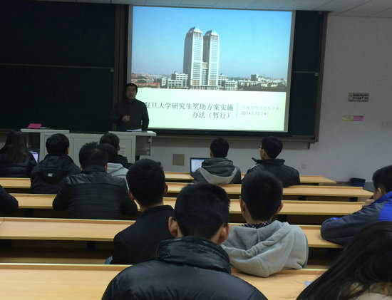 12 月 4 日晚,计算机学院研工组长刘铁江老师召集全院各年级研究生代表,在张江校区 2108 教室,向大家解读《复旦大学研究生奖助方案实施办法(暂行)》的相关内容,并就同学们集中关心的奖学金类别和总额、生活津贴情况以及 14 级直博生相关待遇等做了详细的讲解与说明。
