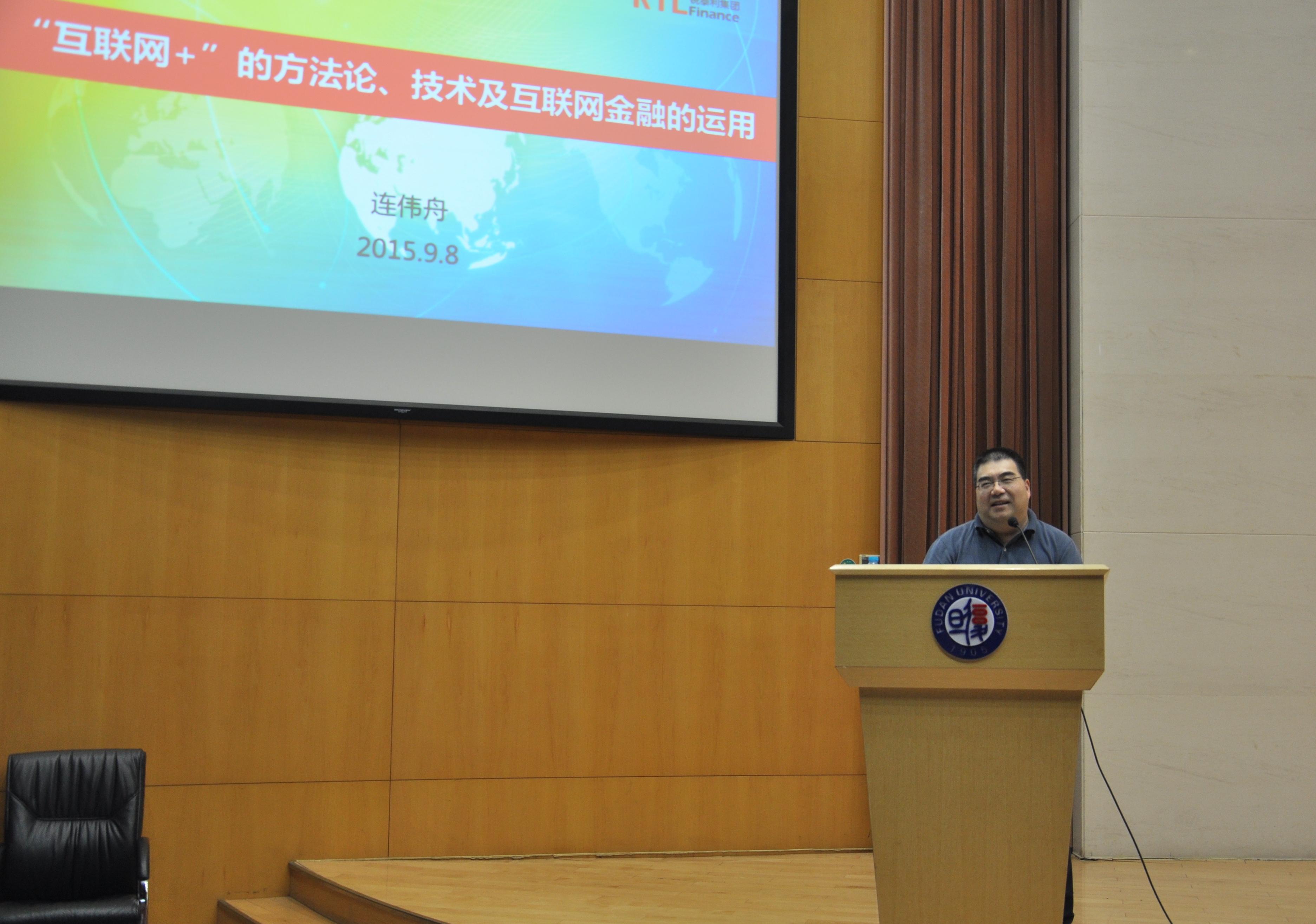 9 月 8 日下午,学院在张江校区行政楼 101 报告厅举办了一场纪念计算机建系 40 周年主题活动暨 2015 年新生开学讲座,邀请到计算机系 85 届校友连伟舟先生带来一场题为 “传统产业互联网+的方法论、业务模式及技术与互联网金融的运用” 的演讲,近 300 名本科生和研究生聆听了演讲,其中包括从邯郸校区专门赶到张江校区参加讲座的一年级本科新生。