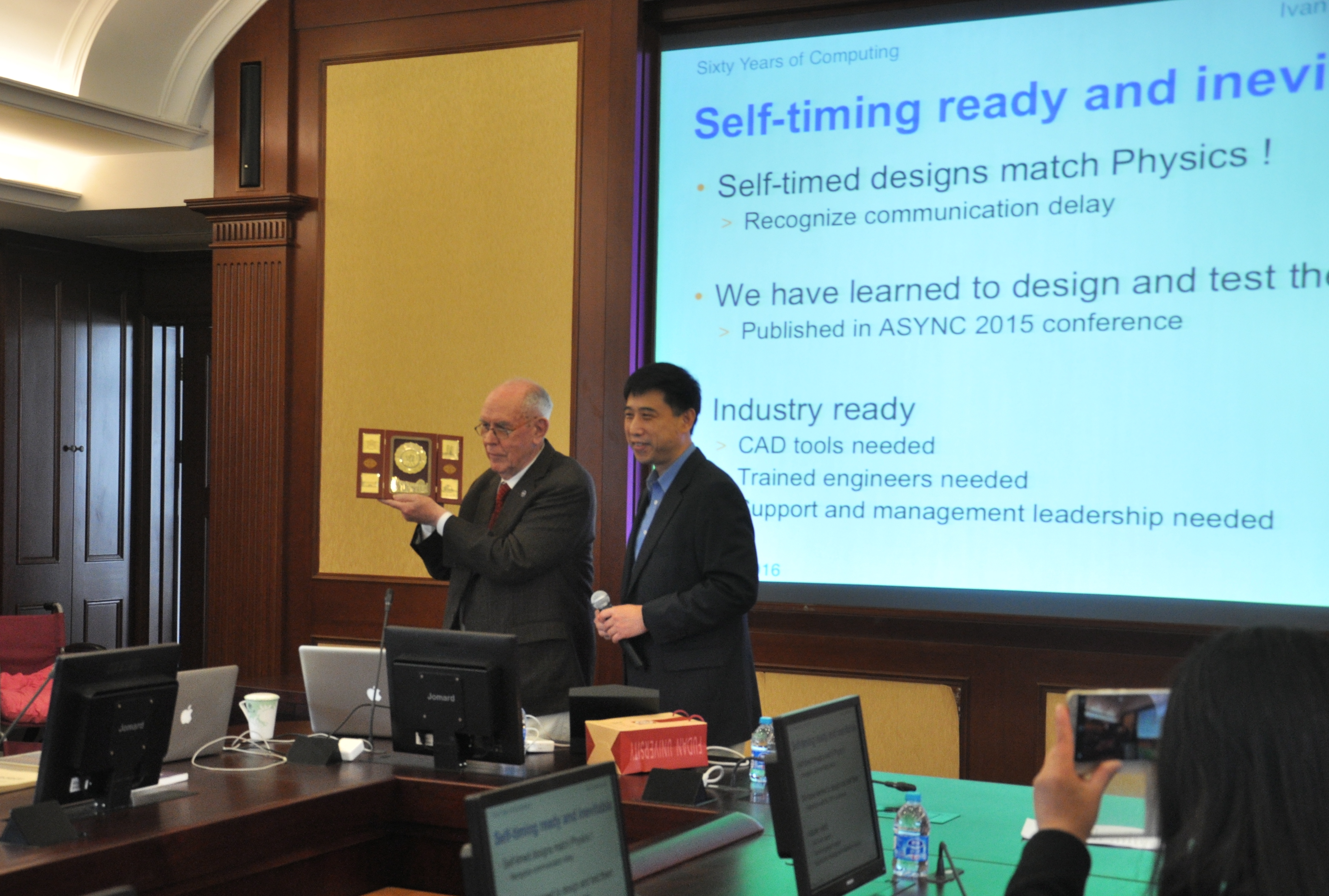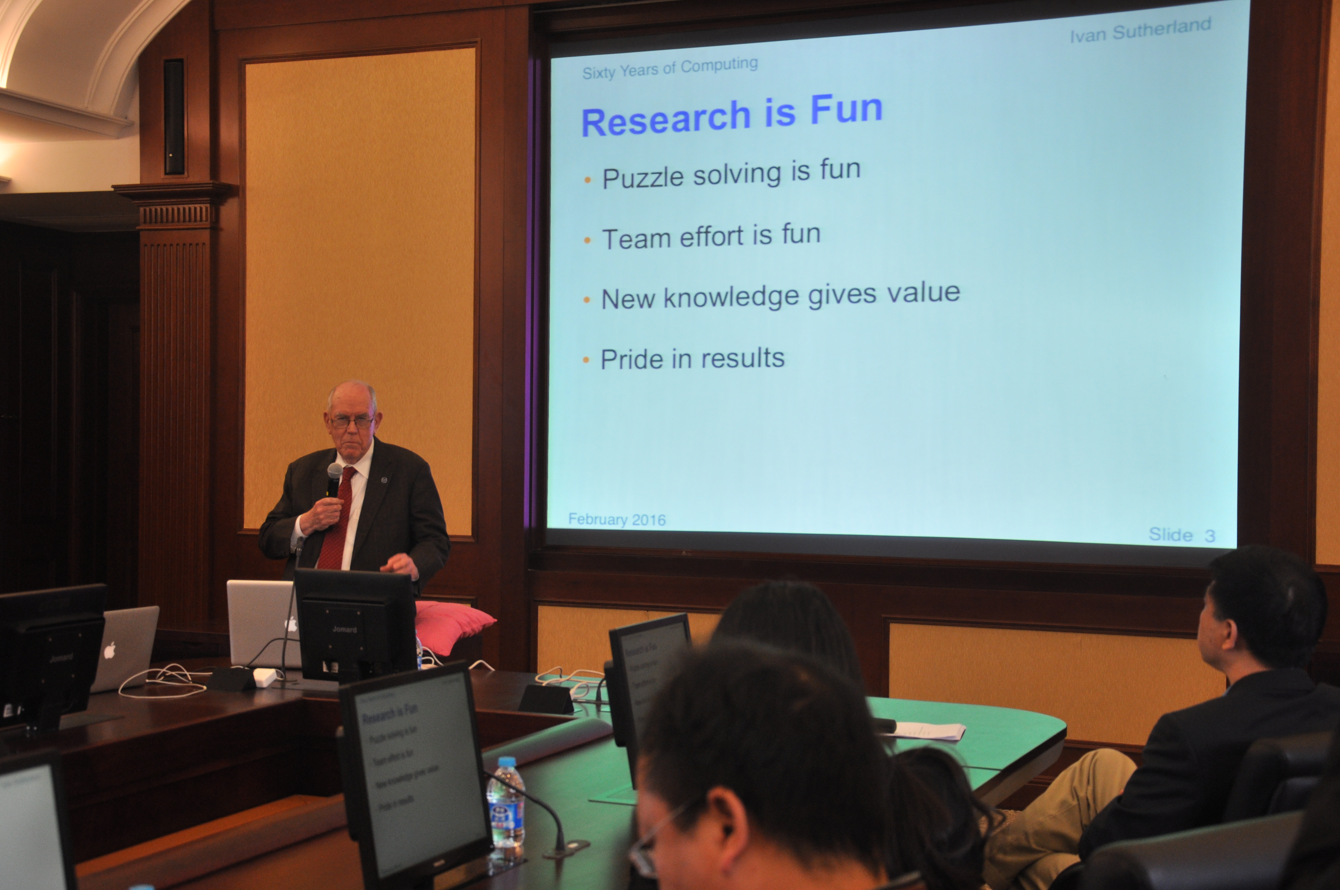'''2016 年 2 月 26 日,图灵奖得主 Ivan Sutherland 教授来我校访问。我院作为主办单位之一,邀请 Ivan Sutherland 教授在邯郸校区子彬院 205 报告厅举办了一场题为 “Sixty Years of Computing: A Personal Recollection” 的学术报告会。该报告会作为我院 Distinguished Speakers Series 特色系列讲座吸引到了来自国内企业界和高校及高中 60 余位专业人士。报告会全程由我院王晓阳院长主持。
