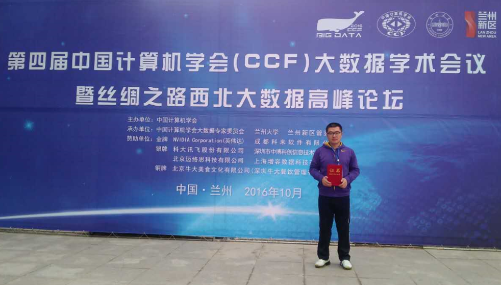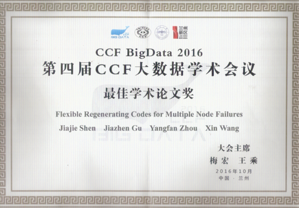 2016 年 10 月 11 至 13 日,第四届 CCF 大数据学术会议(CCF BigData 2016)在甘肃兰州新区举行。CCF 大数据学术会议是中国大数据领域的重要学术会议,本届会议共收到来自学术界、工业界的有效论文投稿 497 篇(包括英文论文 96 篇)。 组委会经过严格评定(预选和答辩),遴选出一篇最佳学术论文。我院的论文 Flexible Regenerating Codes for Multiple Node Failures(大数据存储中面向多节点失效的弹性再生编码研究与构建)喜获这一最佳学术论文奖。该论文研究并优化多节点失效情境下数据存储的修复问题,共同作者为我院博士生沈佳杰、硕士生顾嘉臻、周扬帆老师与王新老师。
