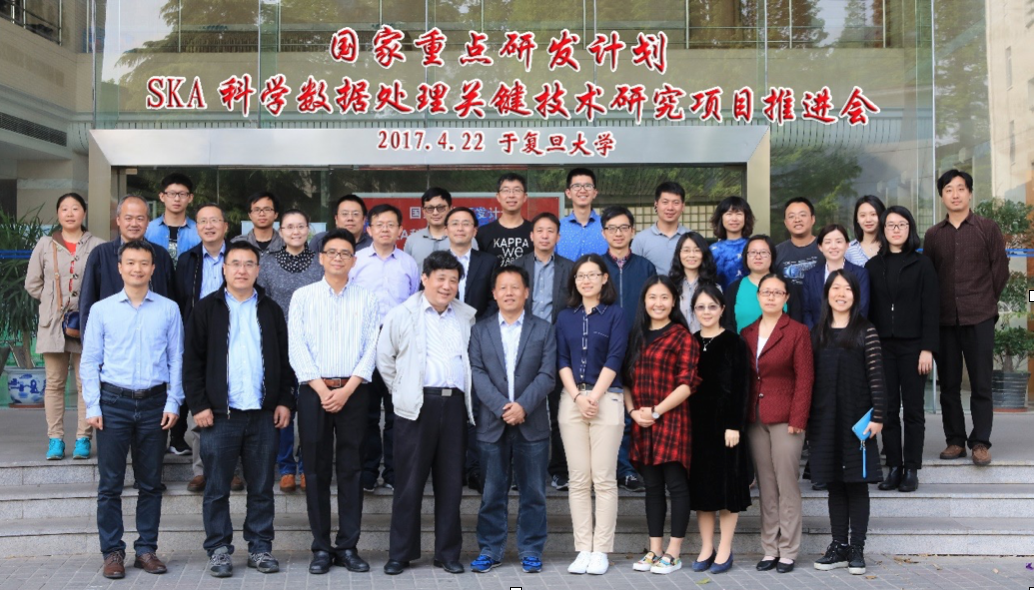 2017 年 4 月 22 日下午,复旦大学计算机科学技术学院在逸夫科技楼会议室 3 成功举办了国家重点研发计划《SKA 科学数据处理关键技术研究》项目推进会。国际大科学工程—平方公里阵列射电望远镜(Square Kilometre Array,以下简称 SKA)是国际天文界计划建造的世界最大综合孔径射电望远镜,其接收面积达一平方公里,预计比目前最大的射电望远镜阵 (JVLA) 的灵敏度提高约 50 倍,比我国目前最大的单口径射电望远镜(FAST)的灵敏度提高约 10 倍,为人类认知宇宙提供了重大机遇。SKA 产生的科学大数据需 30 倍的天河 2 处理能力,SKA 反射面天线数据传输率是现有因特网传输率 10 倍,而孔径阵列数据传输率比现有因特网传输率高 100 倍以上,给现有的计算、网络传输带来了巨大的挑战。当前,全球约有十几个国家包括中国、英国、荷兰、澳大利亚、南非等几十个科研机构的天文学家和计算机等多个领域工程师参与 SKA 的建设。
