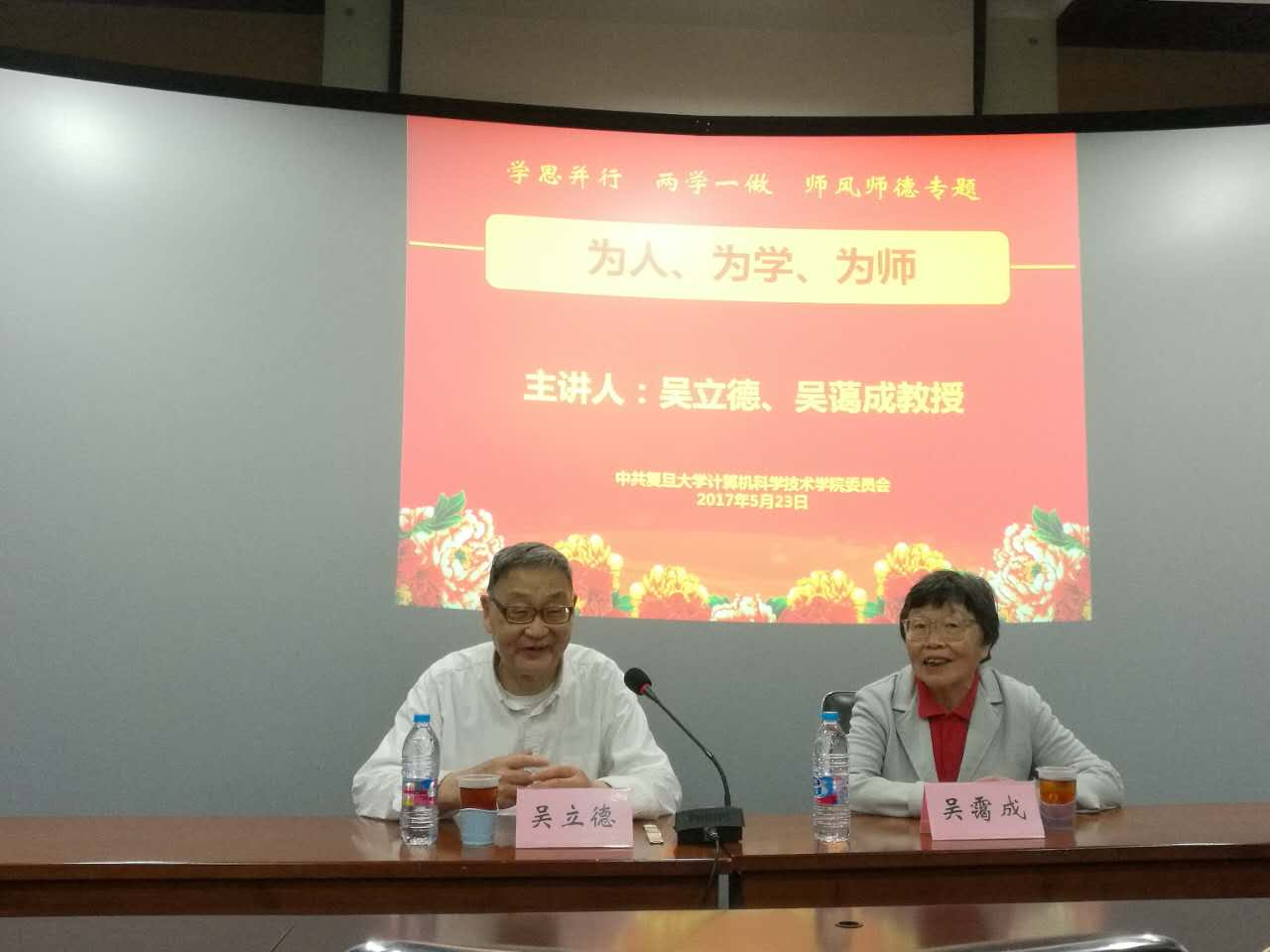 5月23日下午,由学院党委举办的 “学思并行、两学一做、师风师德” 专题党课在张江校区软件楼105会议室举行。此次党课以 “为人、为学、为师” 为主题,邀请学院退休教师吴立德教授、吴蔼成教授主讲,全院教师党员、学生党支部书记及学生党员代表参加了此次专题党课。专题党课由许晓茵书记主持。
