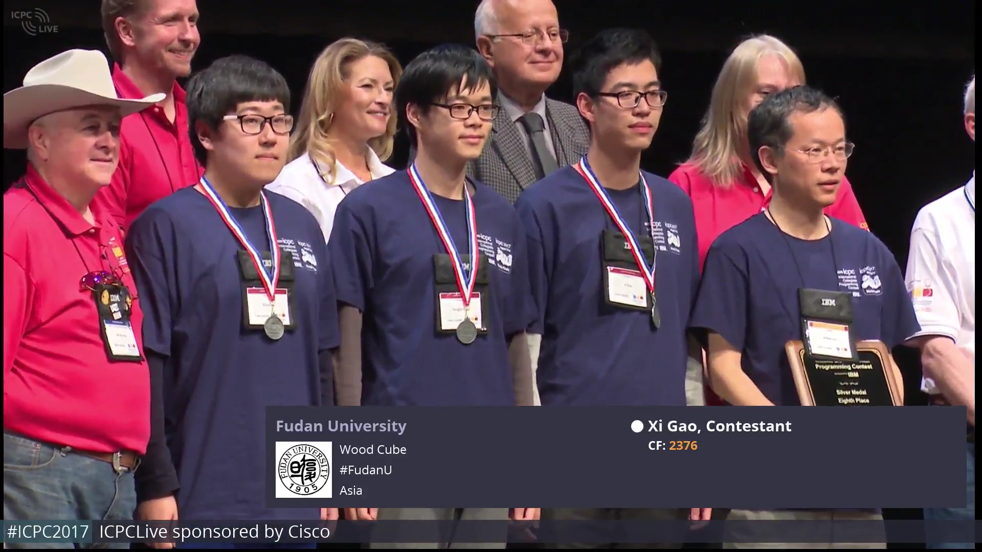 在美国当地时间2017年5月24日刚刚结束的2017年国际大学生程序设计竞赛(ACM-ICPC)全球总决赛的比赛中,复旦大学代表队获第8名,荣获银牌。
