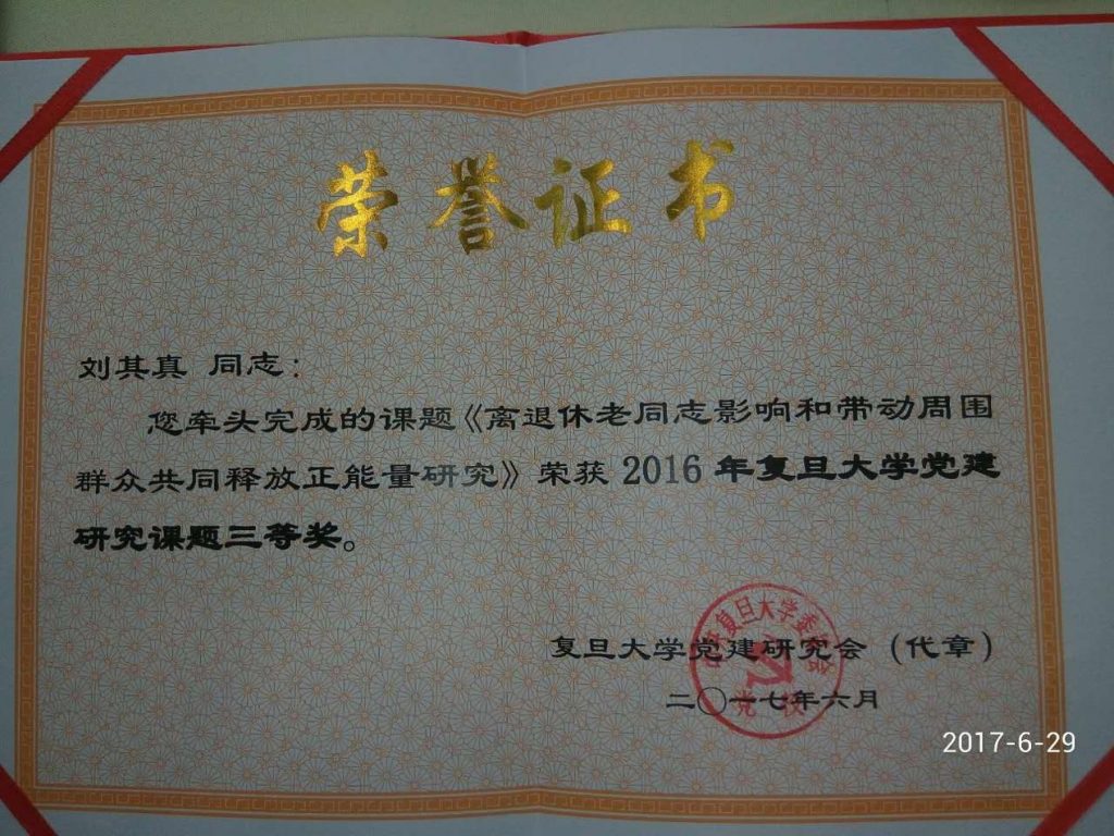 在6月28日举行的复旦大学庆祝中国共产党成立九十六周年座谈会暨主题党课上,校党委党校公布了2016年复旦大学党建研究课题获奖名单。我院退休教师支部书记刘其真老师主持的《离退休老同志影响和带动周围群众共同释放正能量》课题荣获三等奖。