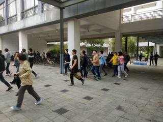演练活动的第一部分是火灾疏散演习。随着楼内的警铃响起,老师和同学们迅速离开办公室和实验室,在楼层安全员的指引下有序的撤离大楼,前往指定的疏散点集中。同时,安全员对撤离的人员进行清点,确保没有人滞留在楼内。在疏散点集中后,保卫处老师对疏散的过程进行了讲评,提醒大家在火灾逃生过程中的注意事项,并再次强调实验室的安全事项。