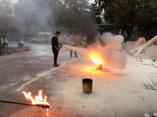 火灾疏散演习之后,学院组织全体一年级新生进行了灭火器使用培训。培训首先由校区安保经理向大家讲解了灭火器的基本知识和使用要点,随后,点燃起两个着火桶,每一个同学都拿起灭火器进行了操作练习。在练习过程中,校区保安不时的提醒操作规范,并纠正同学们的错误动作。