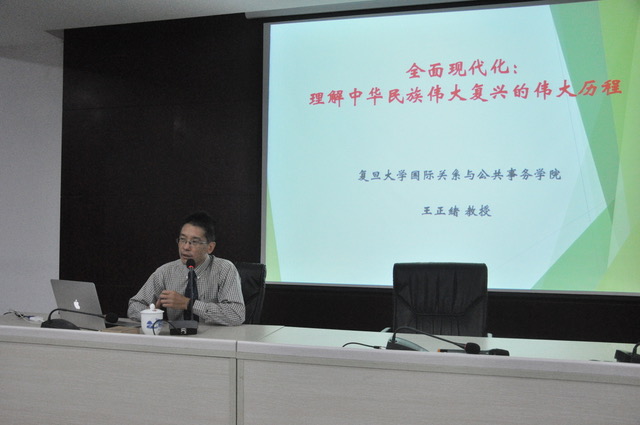 本次报告会首先由来自国际关系与公共事务学院的王正绪教授为大家做题为 “全面现代化:理解中华民族伟大复兴的伟大历程” 的报告。王正绪教授围绕从全球史的角度理解中华民族伟大复兴、小康以后怎么办、现代化的经济社会学分析、全面现代化的思想、对未来的展望等五个方面,向大家介绍和分析了十九大报告中新时代党的奋斗目标和实现路径。王正绪教授的讲解结合了大量生动的史料和实例,深入浅出,让师生们对十九大召开的背景和国家未来的发展道路有了深刻的理解。