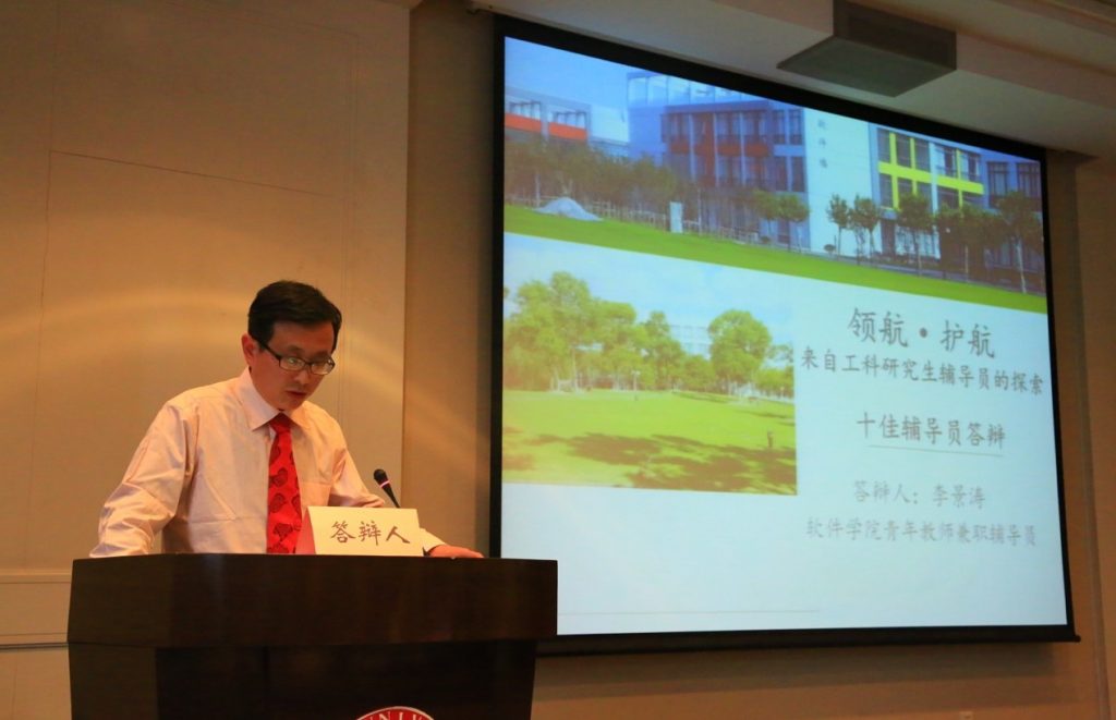 李景涛是我院青年教师,自 2013 年起担任软件学院研究生辅导员,负责软件学院全体硕士研究生的思想政治教育及日常管理工作;自 2017 年 10 月起,因研究生人数增加,调整为担任 2017 级硕士研究生辅导员。在近 5 年的辅导员的工作中,李景涛尽心尽力、扎实细致,关心每一位研究生的成长与发展。辅导员工作让他有机会更多的走进学生的心灵、有机会更多的将教师这份工作放到立德树人的大事业中去思考,这是一种难得的经历与际遇。李景涛老师所带领班级获得 2016 年度、2017 年度研究生优秀班集体,及第三届组织生活优秀案例大赛优秀奖。