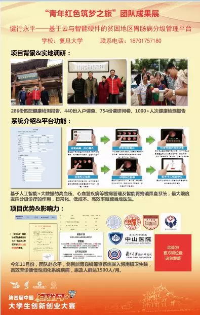 复旦大学共有 318 个项目、1245 人次报名参加,层层选拔后共 15 个项目入围市赛,最终共有五个项目脱颖而出入围全国总决赛。由计算机科学技术学院牵头的参赛项目 “健行永平:基于云与智能硬件的贫困地区肠胃病分级管理平台” 最终荣获国赛银奖及上海市赛金奖!