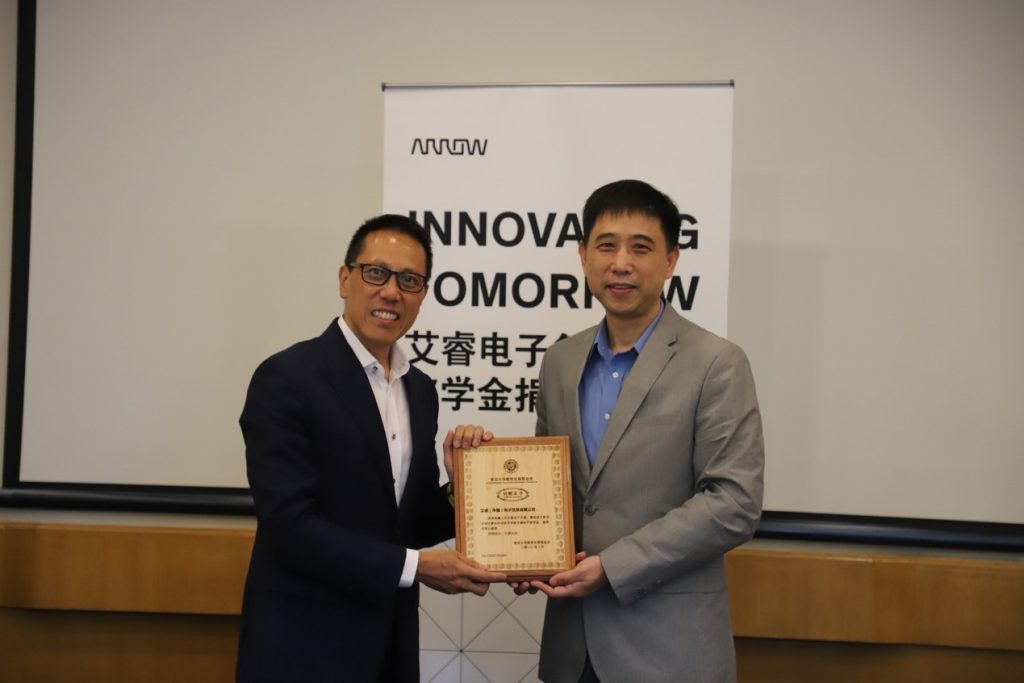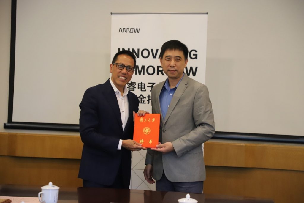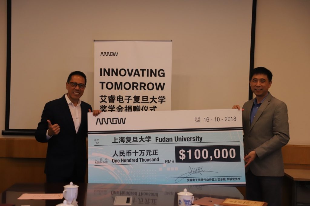 捐赠仪式上,余敏宏先生代表艾睿电子赠予捐赠奖学金支票,王晓阳院长代表学院颁发捐赠证书,并为余敏宏先生颁发复旦大学 MSE 客座讲师聘书。