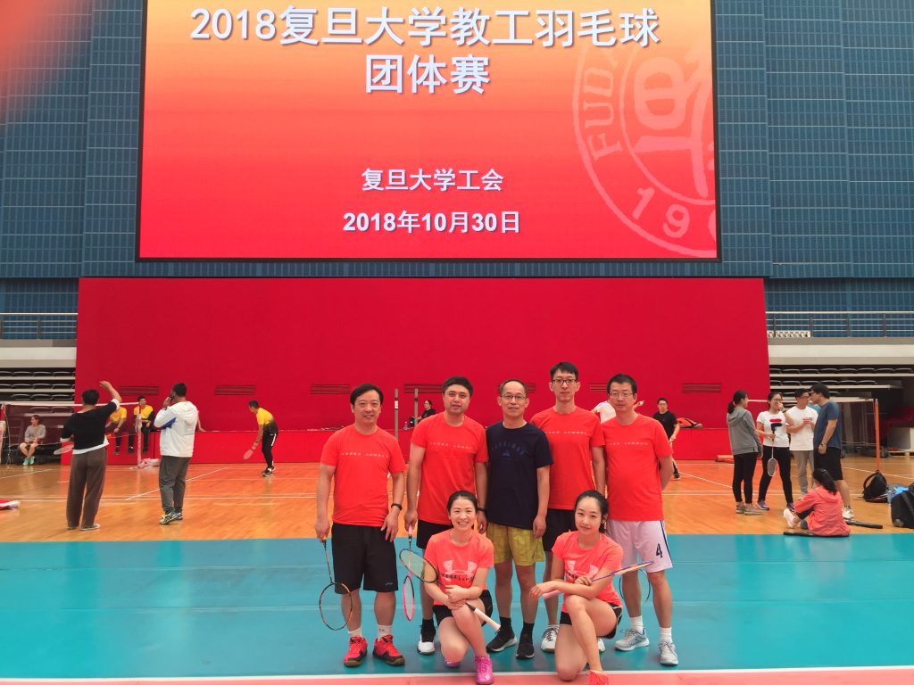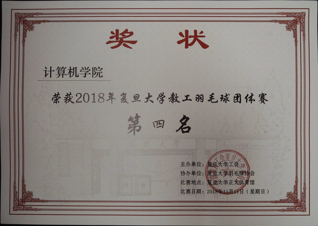 2018 年复旦大学教工羽毛球团体赛于 11 月 11 日落下帷幕。计算机学院羽毛球代表队团结一心,奋勇拼搏,最终获得第四名的成绩。该项赛事每两年举办一次,包括男单、混双、男双三项比赛,今年共有 20 支队伍参赛。10 月 30 日分四组先进行单循环比赛,每个小组的前两名队伍参加 11 月 11 日进行的决赛阶段比赛。