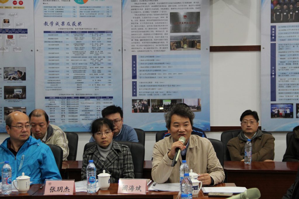 参观结束后,项聪处长来到软件楼 102 第二会议室,审核评估汇报会正式开始。王晓阳院长代表计算机科学技术学院与软件学院对项聪处长的到来表示欢迎和感谢,并对学院本科教学工作进行了汇报。首先王院长介绍了学院本科教学工作现状。第一,学院重视人才培养顶层设计和培养,对本科教学定位为 “打造一流队伍,建设一流学科,培养一流人才”,目标是全面贯彻党的教育方针,紧紧围绕为党育人为国育才的责任使命,德智体美劳全面发展、具有良好科学素养的国际化创新型高层次计算机类学科研发与管理人才。第二,学院师资队伍结构合理,优秀人才层出不穷,重视教学团队建设,不断提高学院教育教学质量。第三,在充分合理利用学校教学经费拨款的基础上,通过学院自筹收入的支出向本科教学倾斜,保障本科教学质量和发展,在教学平台、资源、设施建设上加大投入。同时进一步完善专业设置与培养方案,对应荣誉计划、新工科需求进行及时调整。第四,学院积极进行教学改革,加强双语教学、实践教学和翻转课堂的混合式教学,注重学生培养并取得了丰硕成果。第五,学院通过高考统招(包括大类专业分流)、学校腾飞计划、中学生竞赛和转专业等渠道获得高质量生源,重视对学生的指导与服务,注重学风建设与学习效果,使学生成绩和综合素质保持较高水平,毕业生就业率与薪酬在全校名列前茅。第六,学院为本科教学提供质量保障体系,建立了一系列规章制度和教学质量管理与评价体系,对质量信息的收集利用与质量监控过程进行一体化管理,多渠道反馈,多形式沟通。