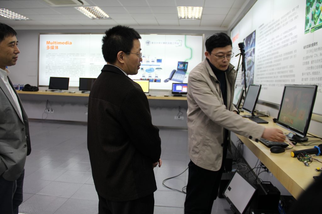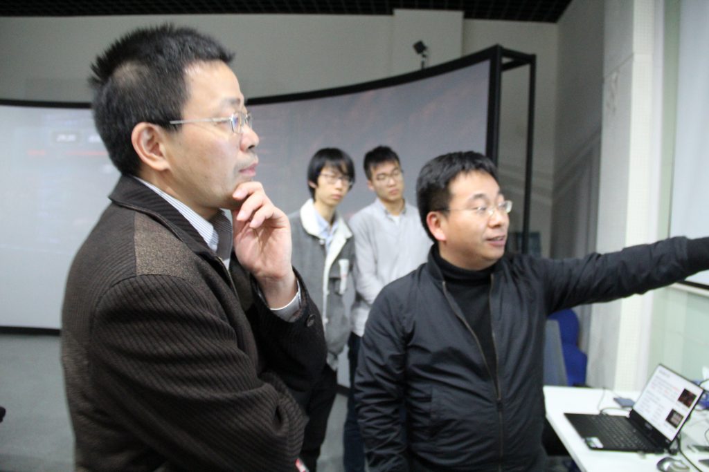 会前,王晓阳院长、汪卫副院长等陪同评估专家参观了学院的实验室和教学设施并介绍了学院近年来的工作进展情况。首先一行人来到学生机房与学院云计算机房,陈辰老师向专家介绍了国家级实验教学示范中心的情况,包括承担了全校计算机学科相关的本科基础课、专业课、选修课、公选课等课程,以及为相关学生的课外科创实践活动提供环境和技术支持等内容。随后参观了上海市数据科学重点实验室数据界探索环境展示厅,廖志成老师向专家介绍数据界探索环境在支撑二专建设和本科生培养方面的具体作用,以及数据驱动科学研究的变革、数据科学和大数据的创新研究成果等。接着参观了青少年实践站,张向东老师介绍了实践站是依托复旦大学计算机学科的教学和科研资源,以生动的实验来展示计算机科学,让学生体验当前计算机技术的最新进展,激发学生对计算机技术的兴趣,这里也是复旦大学与上海市科委、教委共建的一个青少年创新人才培养平台。最后,项聪处长来到学院交互式图形学实验室,姜忠鼎老师与同学们一起演示实验室科研成果——沉浸式虚拟现实技术与系统等在互动娱乐、网络社交、教育培训等领域的创新应用,这项科研成果位居全国高校前列。