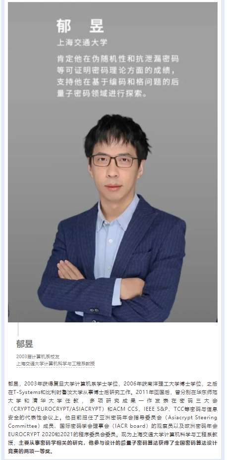 郁昱,2003 年获得复旦大学计算机系学士学位,2006 年获南洋理工大学博士学位,之后在 T-Systems 和比利时鲁汶大学从事博士后研究工作。2011 年回国后,曾分别在华东师范大学和清华大学任教,多项研究成果一作发表在密码三大会(CRYPTO/EUROCRYPT/ASIACRYPT)和 ACM CCS、IEEE S&P、TCC 等密码与信息安全的代表性会议上。他目前担任了亚洲密码年会指导委员会(Asiacrypt Steering Committee)成员、国际密码学会理事会(IACR board)的观察员以及欧洲密码年会 EUROCRYPT 2020 和 2021 的程序委员会委员。现为上海交通大学计算机科学与工程系教授,主要从事密码学相关的研究,他参与设计的后量子密码算法获得了全国密码算法设计竞赛的两项一等奖。
