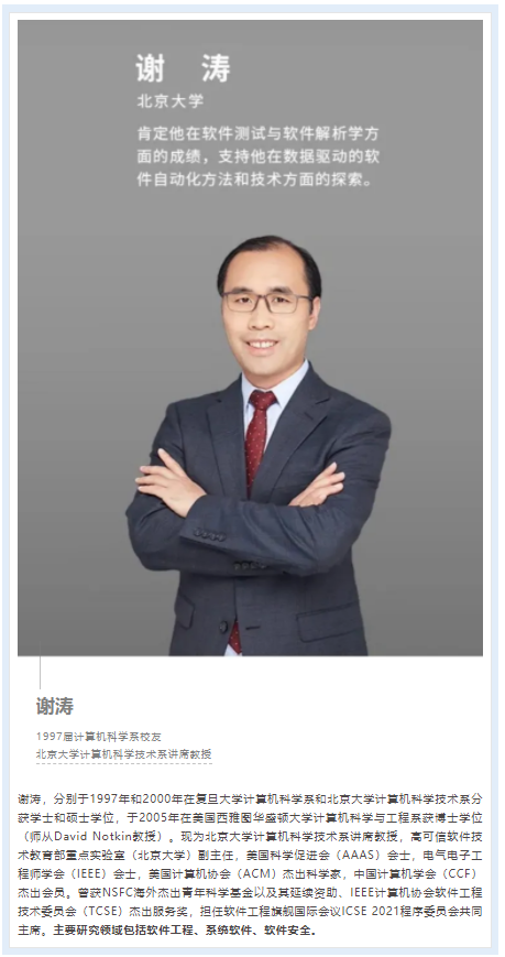 谢涛,分别于 1997 年和 2000 年在复旦大学计算机科学系和北京大学计算机科学技术系分获学士和硕士学位,于 2005 年在美国西雅图华盛顿大学计算机科学与工程系获博士学位(师从 David Notkin 教授)。现为北京大学计算机科学技术系讲席教授,高可信软件技术教育部重点实验室(北京大学)副主任,美国科学促进会(AAAS)会士,电气电子工程师学会(IEEE)会士,美国计算机协会(ACM)杰出科学家,中国计算机学会(CCF)杰出会员。曾获 NSFC 海外杰出青年科学基金以及其延续资助、IEEE 计算机协会软件工程技术委员会(TCSE)杰出服务奖,担任软件工程旗舰国际会议 ICSE 2021 程序委员会共同主席。主要研究领域包括软件工程、系统软件、软件安全。