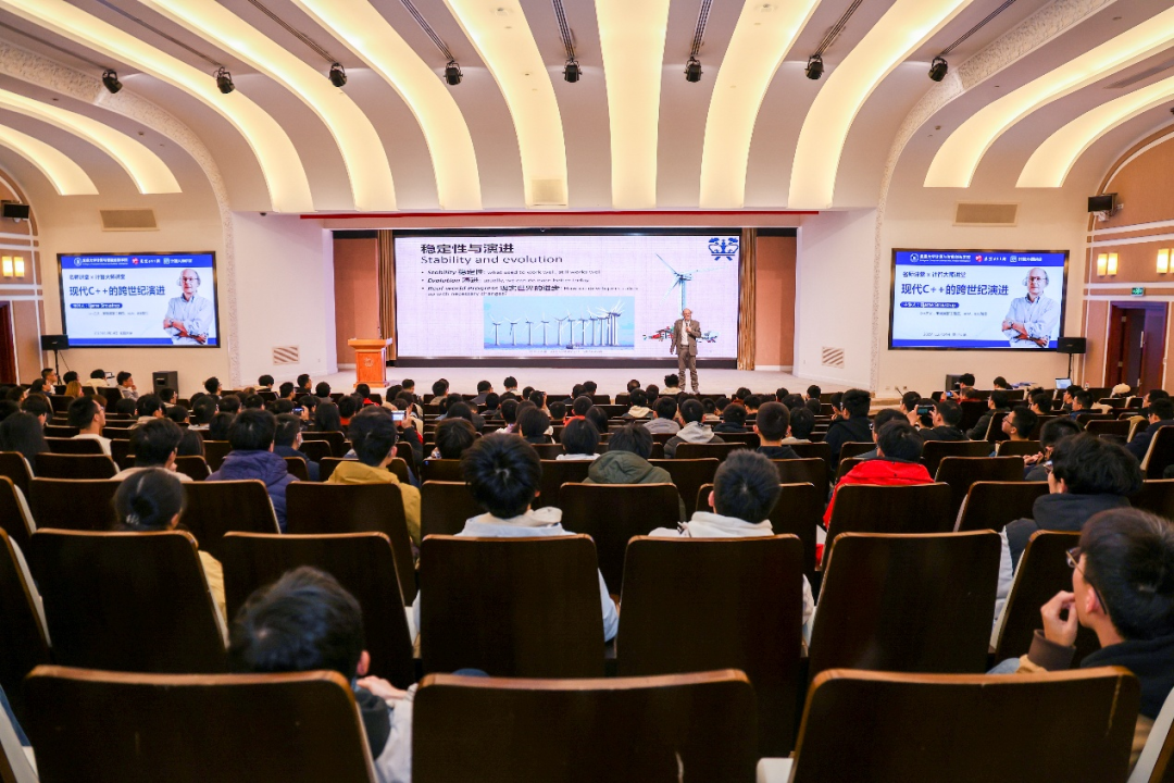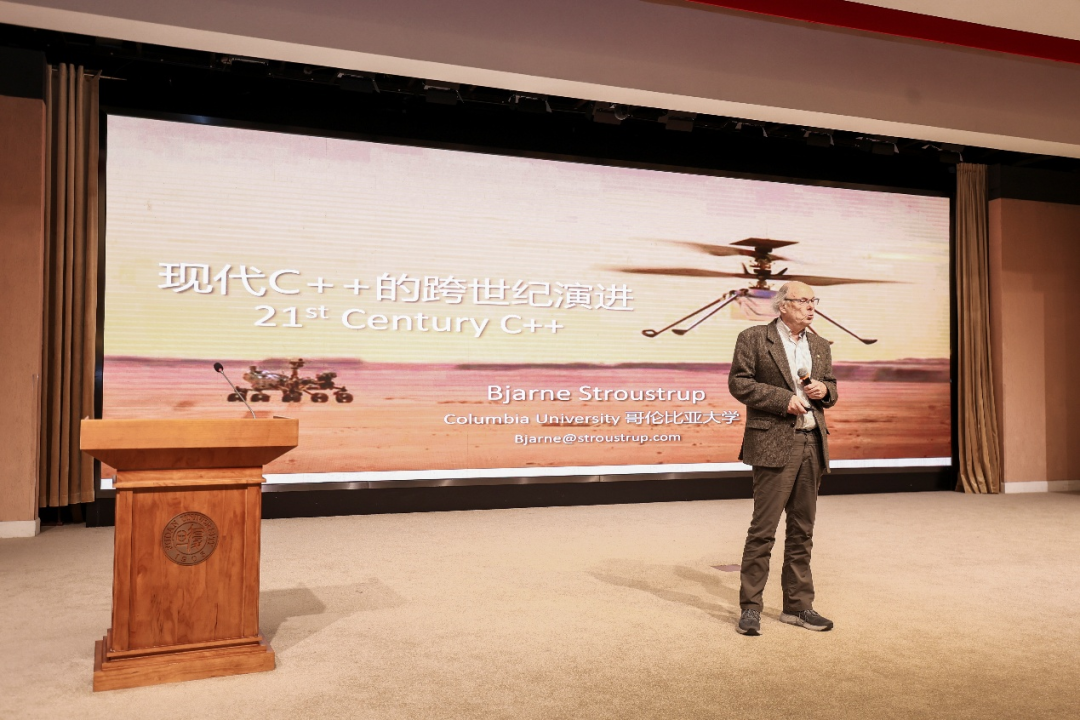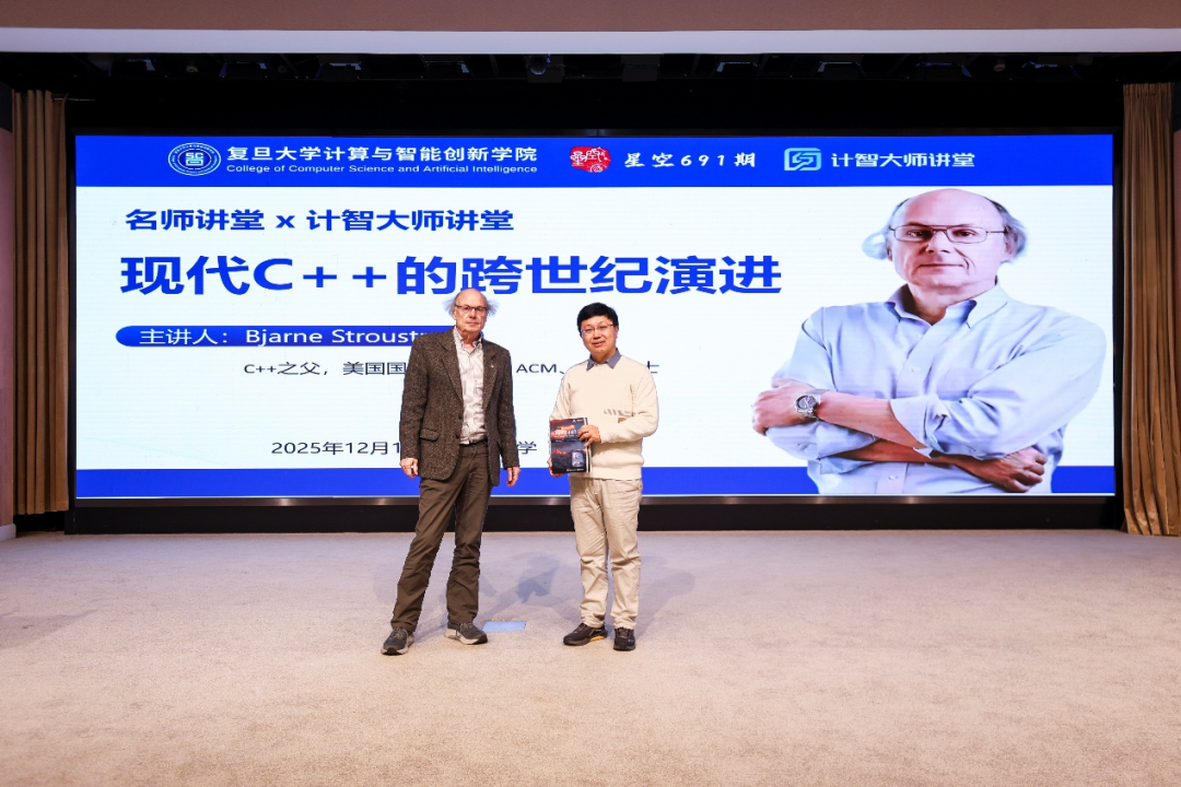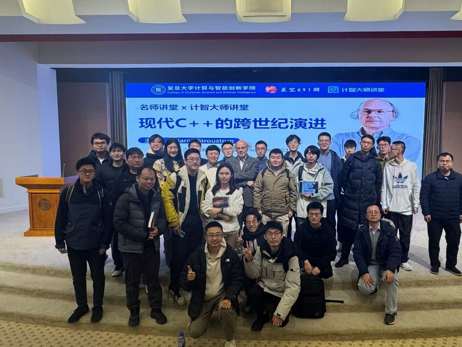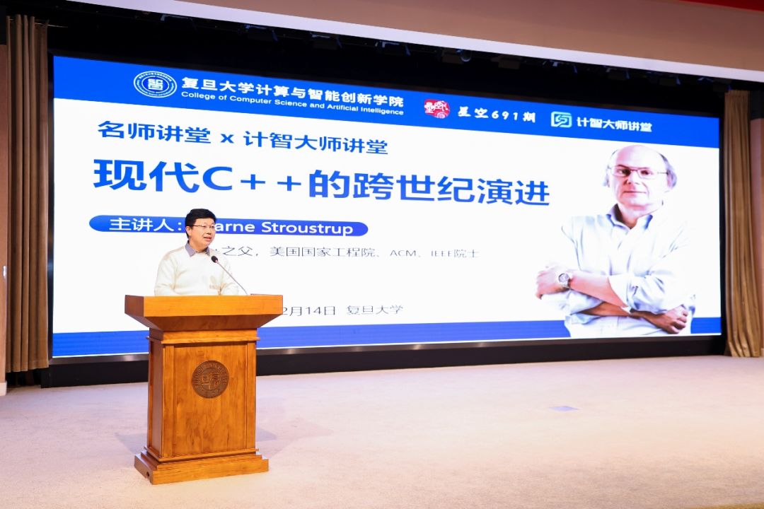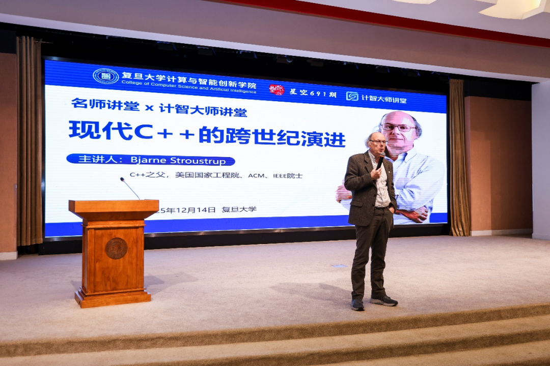 12月14日上午,复旦大学计算与智能创新学院、复旦大学团委联合主办的“名师讲堂”暨“计智大师讲堂”活动在邯郸校区光华楼东辅楼吴天凡报告厅成功举办。本次活动邀请到了C++之父Bjarne Stroustrup教授为广大师生及校友作报告,主题是《现代C++的跨世纪演进》。本次活动由复旦大学学生会、计算与智能学院分团委学生会、CSDN、奇点智能研究院协办。报告会由复旦大学计算与智能创新学院副院长彭鑫老师主持,来自学校各院系的师生以及校友300余人参加了本次活动。