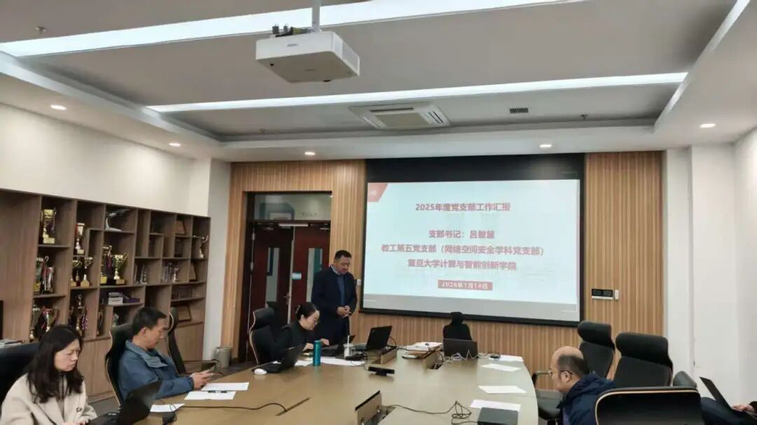 吕智慧老师汇报了教工第五党支部2025年工作小结,支部积极组织各项学习活动,包括深入贯彻中央八项规定精神学习教育、党员集中培训交流研讨、网络空间安全学科研究与发展探讨系列讲座。支部和五官科医院护理第二党支部开展联合党建,推动计算机技术、人工智能、网络空间安全技术与眼耳鼻喉医疗护理领域的创新融合,实现 “党建引领业务、业务促进党建”的双向提升。支部关心青年教师成长,和青年教师多次进行谈心谈话,推荐优秀同志加入党组织,2025年度3名预备党员按期转正。支部党员积极参与“十五五”规划特别是网络空间安全学科的规划编制工作,发挥先锋模范作用。