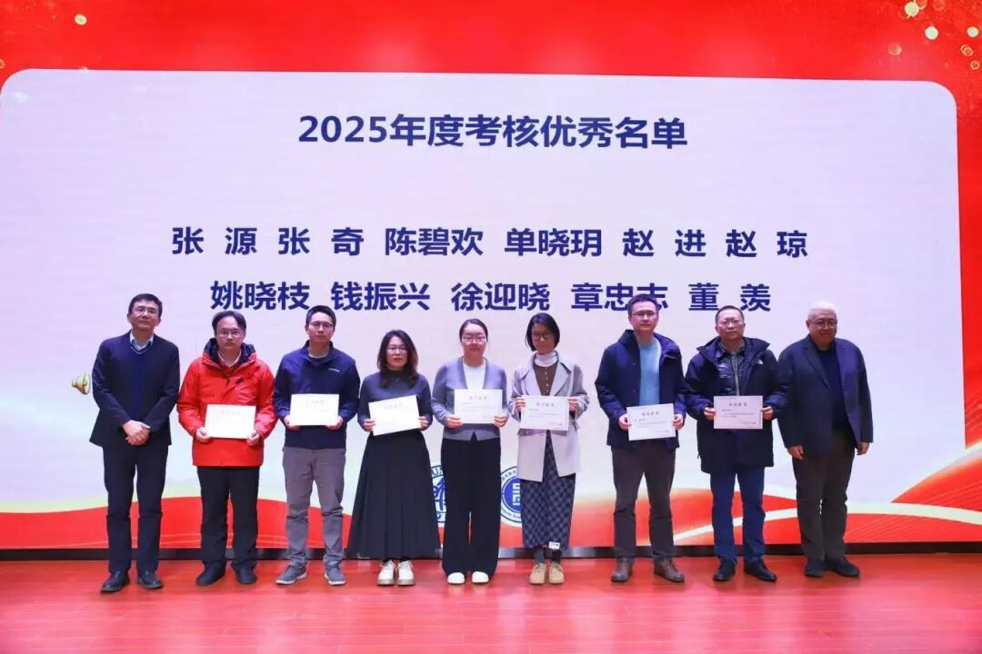 在表彰环节,汪源源为学院2025年度杰出贡献奖(院长奖)获得者及团队颁奖,王新、杨珉为2025年度考核获得优秀的老师颁发荣誉证书,对各位老师一年来的辛勤付出表示感谢。