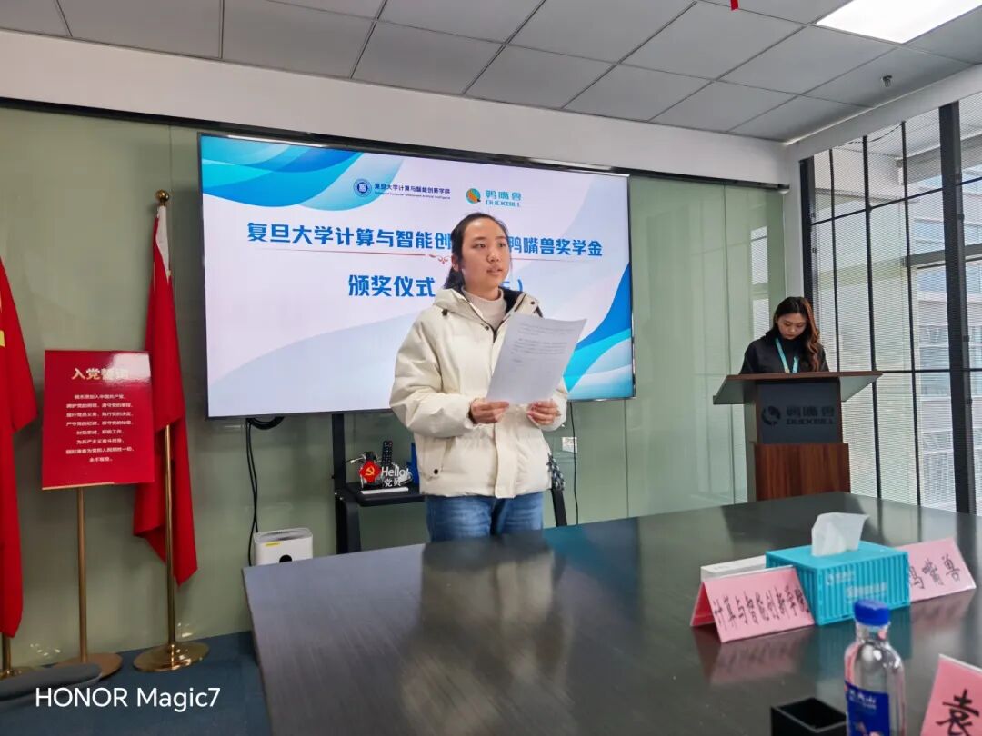 鸭嘴兽创始人唐红斌、首席AI官周明、副总裁谢闽峰、财务负责人林梧桐、HRBP汪倩,计算与智能创新学院党委书记王新,复旦大学党委学工部副部长王茂异,学院党委副书记顾宁,复旦大学团委副书记、学院院长助理、副教授周喆,专职辅导员靳煜出席。颁奖仪式由汪倩主持。