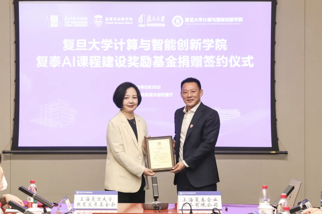 在复旦大学建校120周年之际,5月26日上午,复旦大学计算与智能创新学院复泰AI课程建设奖励基金捐赠签约仪式在复旦大学邯郸校区逸夫楼校董厅举行。