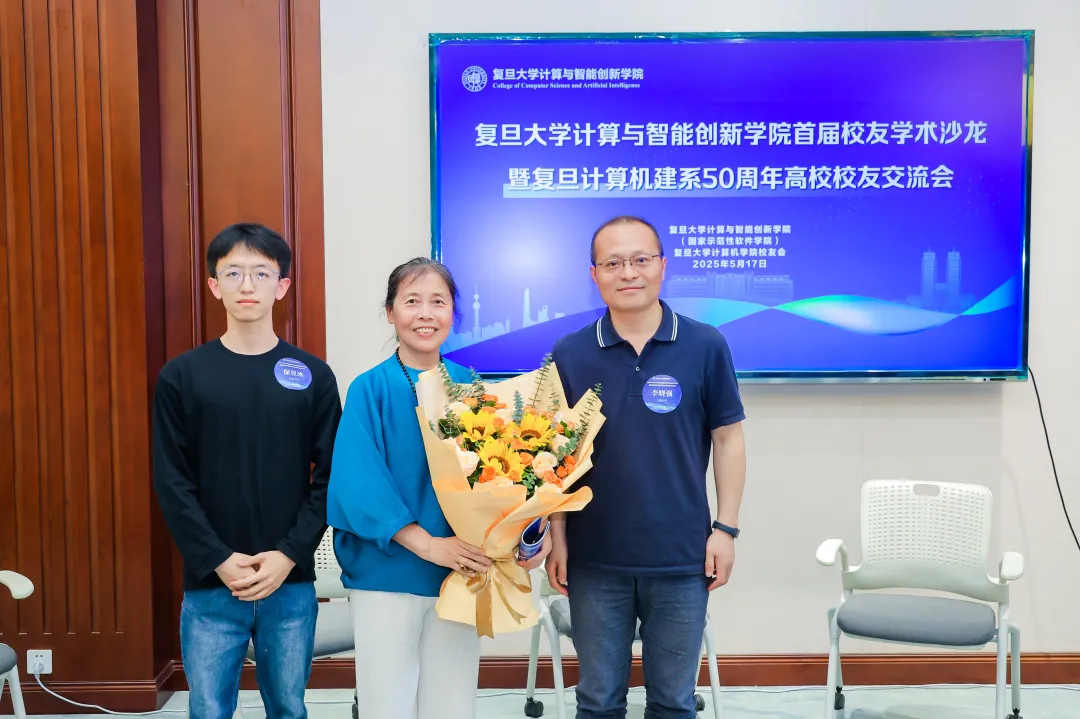 圆桌二由上海大学计算机学院副院长李晓强校友主持。论坛开始前,李老师邀请自己在复旦求学期间的辅导员王小芳(计算机科学系第一届毕业生)老师上台,同现场最年轻的计算与智能创新学院博士生保昱冰同学一起向王老师献花致谢。