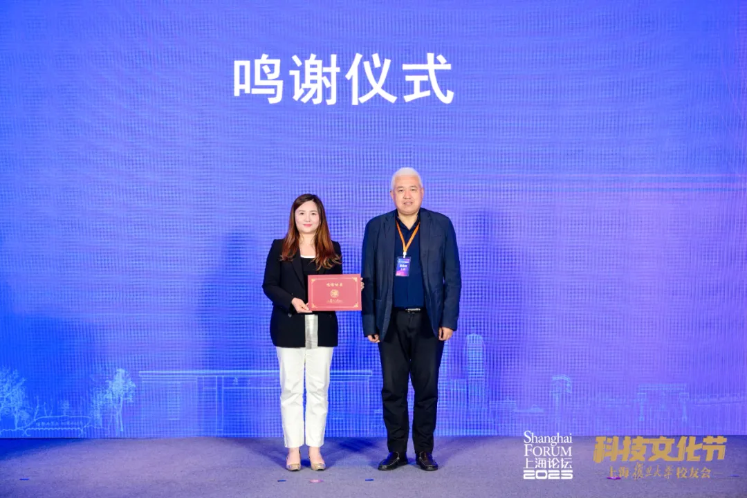 论坛上同时举行了鸣谢仪式,感谢北京智谱华章科技股份有限公司对本次论坛的部分赞助。王新为赞助方代表智谱泛互华东区高级商务经理秦畅颁发鸣谢证书。同时,感谢复旦大学校友总会、复旦上医校友会、共青团复旦大学委员会共同支持。