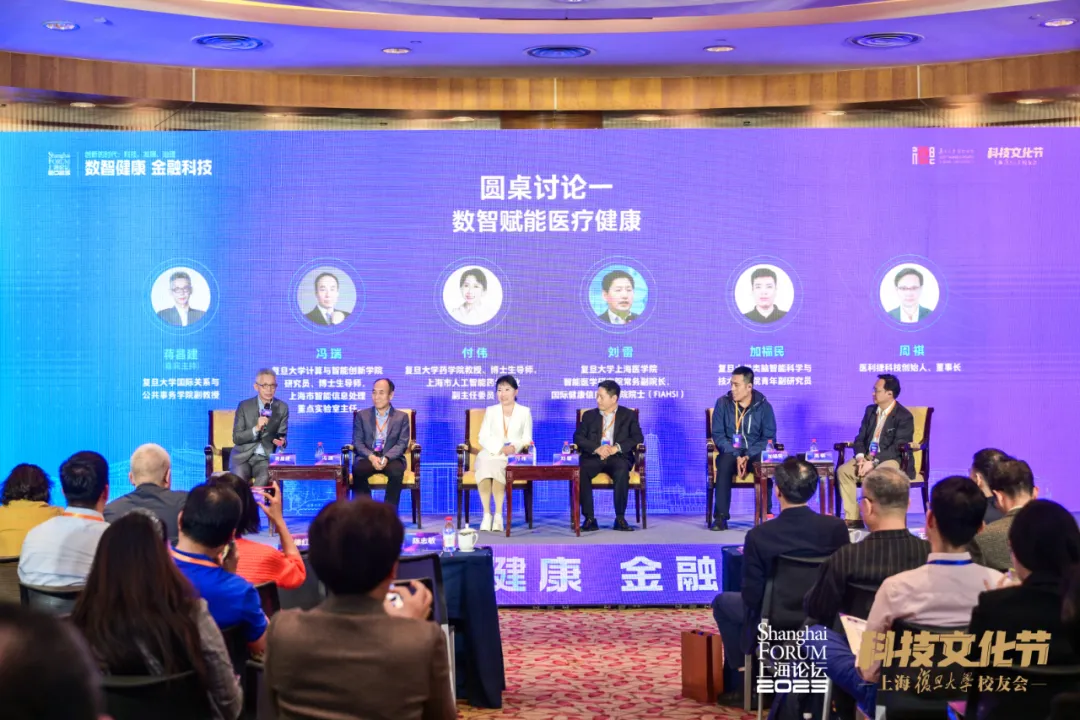 随后进行两场圆桌讨论环节,特邀复旦大学国际关系与公共事务学院副教授蒋昌建作为嘉宾主持。圆桌讨论一以“数智赋能医疗健康”为主题,复旦大学计算机科学技术学院研究员、博士生导师,上海市智能信息处理重点实验室主任冯瑞;复旦药学院教授、博士生导师,上海市人工智能药学专业副主任委员付伟;复旦大学类脑智能科学与技术研究院青年副研究员加福民;复旦大学上海医学院智能医学研究院常务副院长,国际健康信息科学院院士刘雷;医利捷科技创始人、董事长周祺作为圆桌嘉宾,共同围绕数智技术在医疗健康领域的应用展开深入交流,分享前沿成果与见解 。